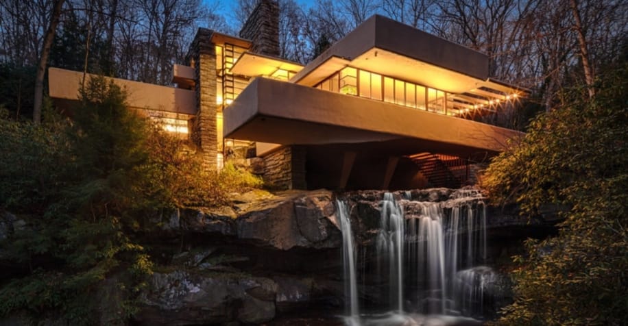 Frank Lloyd Wright’s 1935 Falling Water House shown here at twilight.